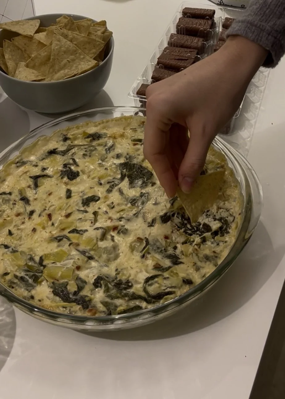 En una olla con un chorrito de aceite de oliva agregamos el ajo y las espinacas. Cuando las espinacas se reduzcan, agregamos las alcachofas, el queso crema, mozzarella rallado y mozzarella fresco. Sazonamos con cebolla en polvo, chili flakes para un toque picante, sal y pimienta.