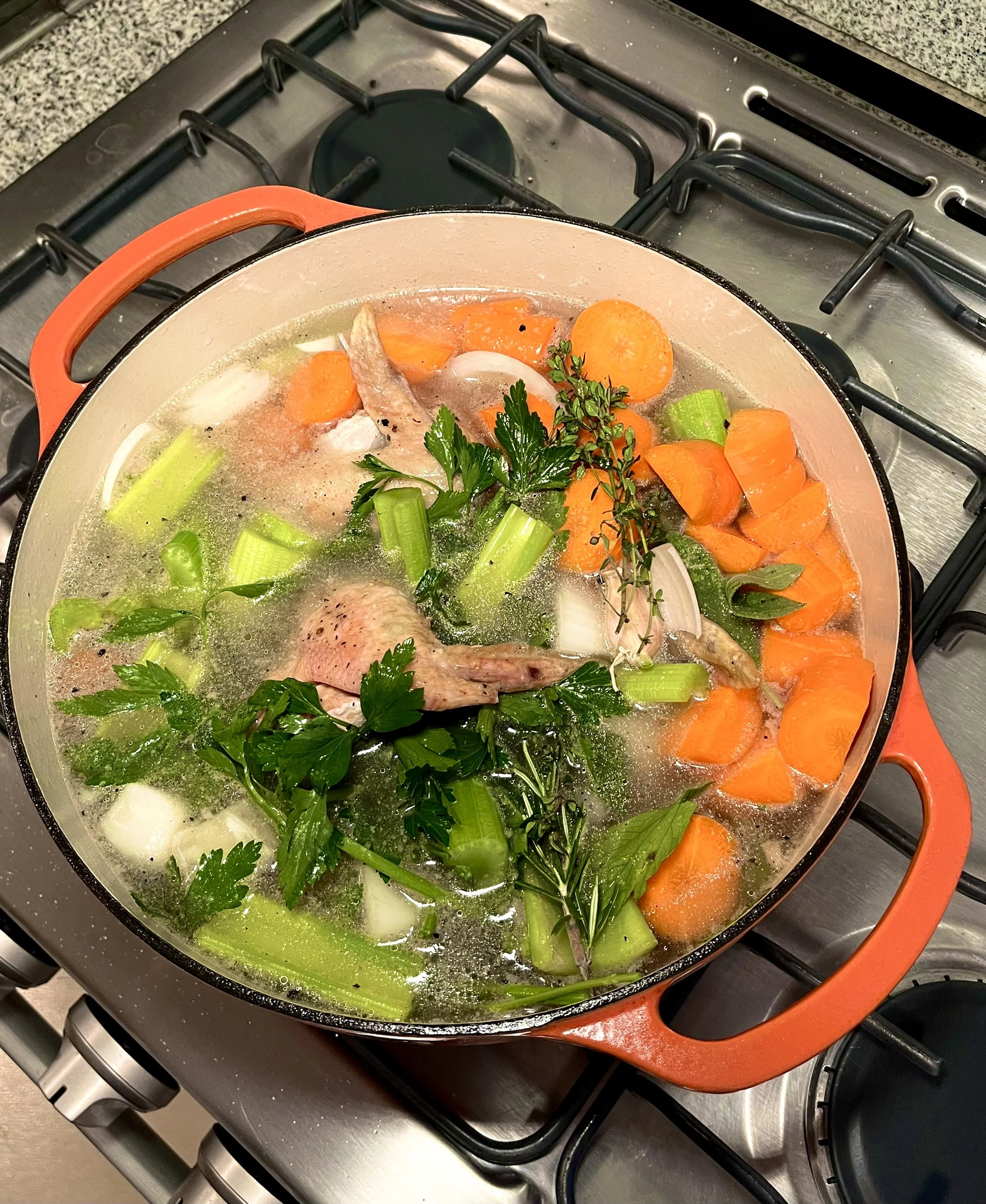 Ya que estén dorados los huesos y el cuello, en una olla vas a agregar, 2 cebollas, apio, zanahoria, perejil, ajo y hierbas de olor. Sazona con sal y pimienta. Permite que hierva a fuego medio cubierto por alrededor de 1h a 1h30.