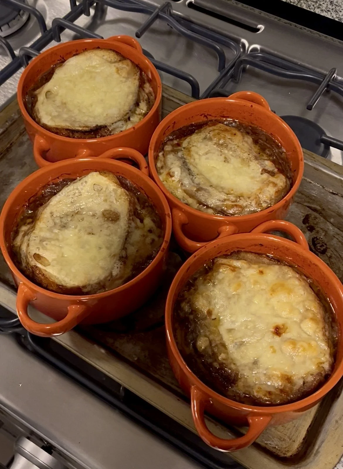 Servimos la sopa en 4 recipientes individuales aptos para horno y ponemos el pan seguido por el queso gruyere. Metemos al horno hasta que el queso quede gratinado.