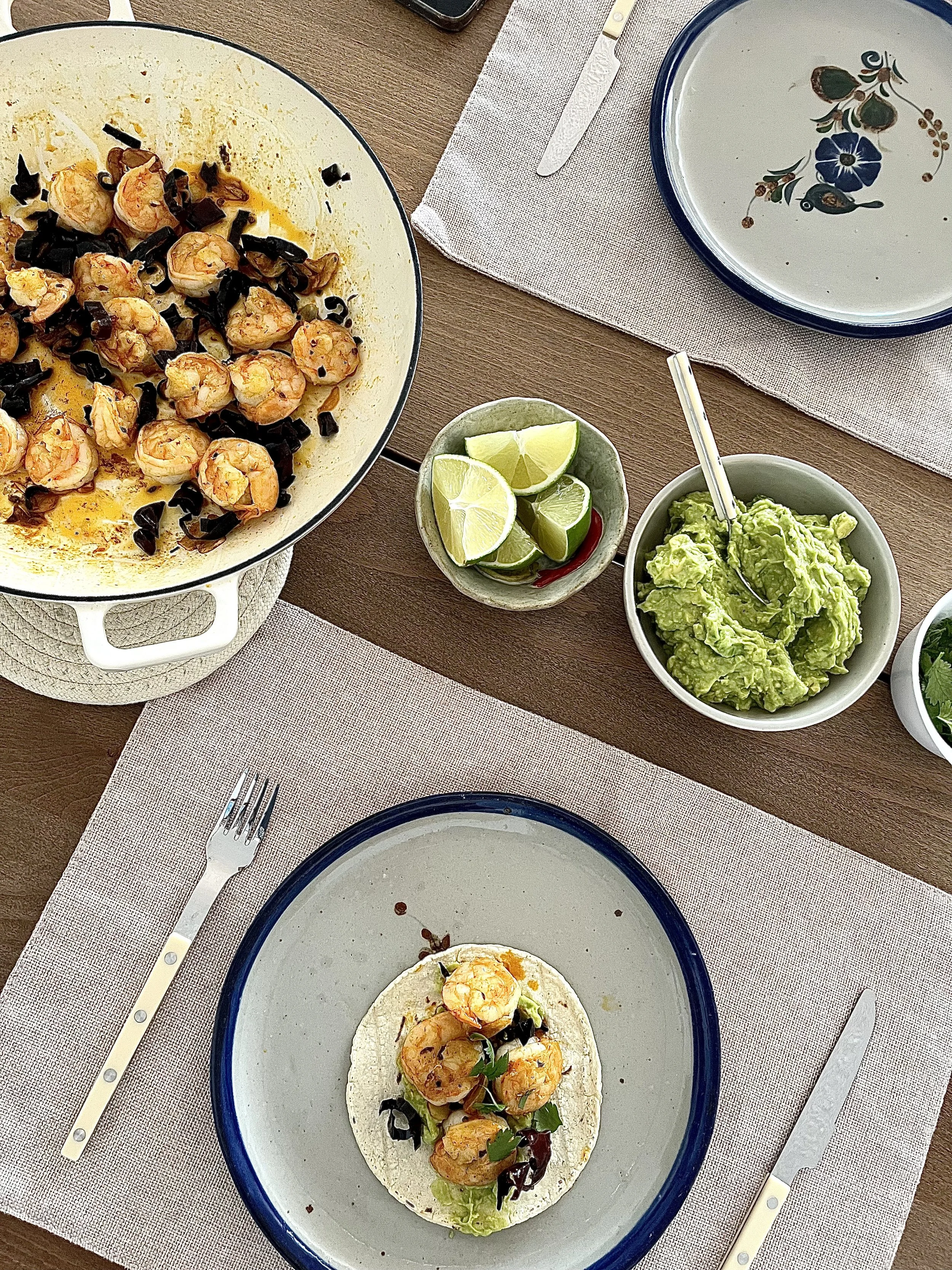 Servimos nuestros tacos con una tortilla de maíz con una cama de guacamole y los camarones al guajillo con ajo. Decoramos con unas hojas de cilantro y un toque de jugo de un limón.