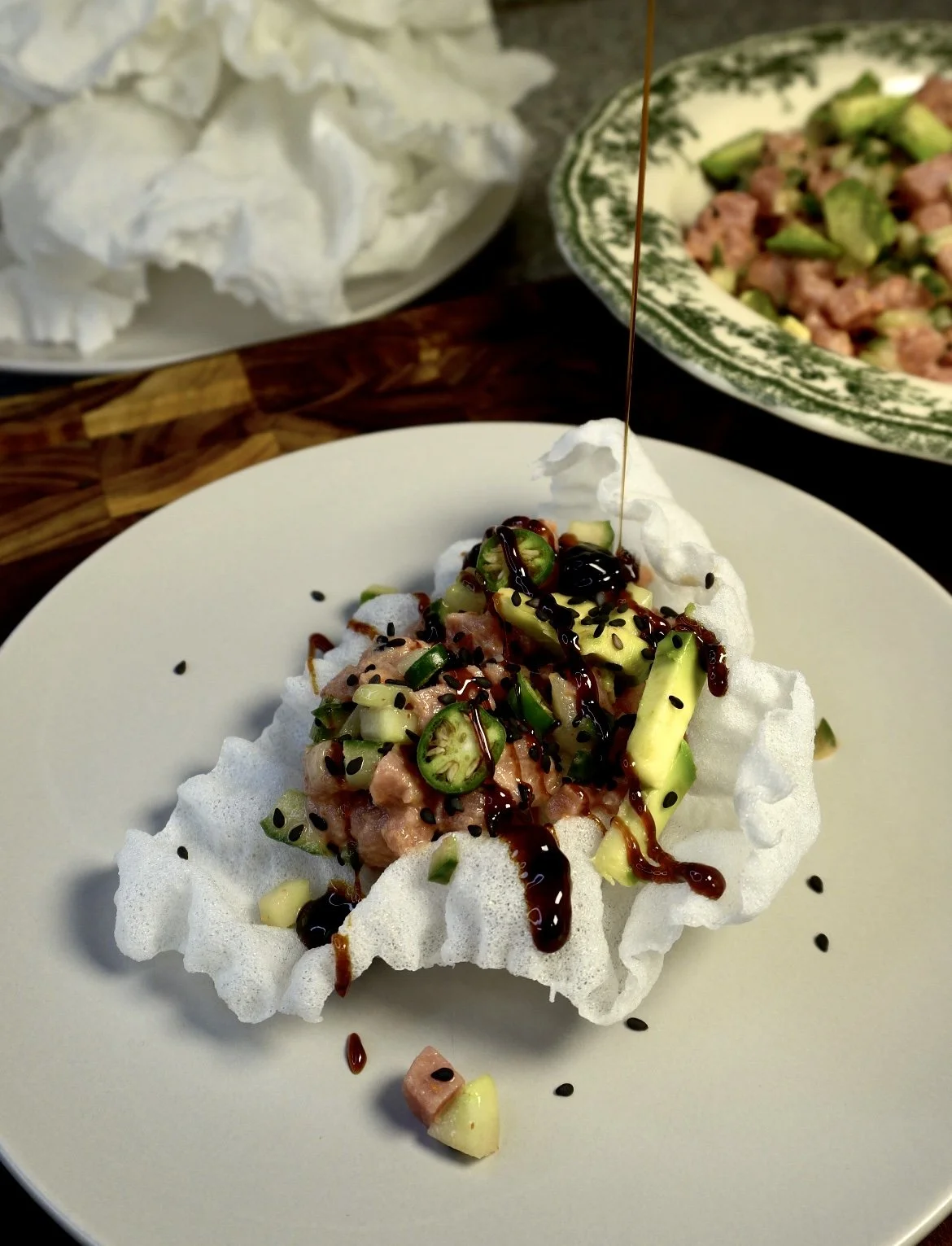 Agregamos el tartar de atún sobre las hojas de arroz, seguido por el aguacate y el chile serrano. Agregamos un chorrito de salsa de anguila y a disfrutar.